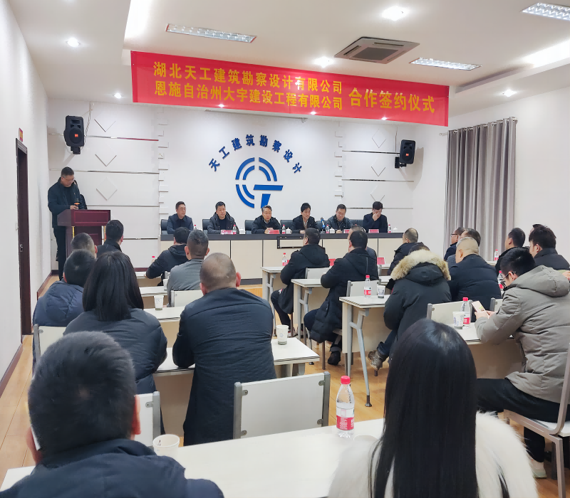 2024年1月18日(農(nóng)歷臘月初八)下午,湖北天工建筑勘察設(shè)計有限公司與恩施自治州大宇建設(shè)有限公司合作簽約儀式在恩施市清江東路2號“天工設(shè)計”五樓會議室舉行。恩施州住建局黨組成員、副局長袁燕奇,恩施州住建局黨組成員、總工胡平,恩施職業(yè)技術(shù)學(xué)院建筑工程學(xué)院院長雷元凱,恩施州建筑業(yè)協(xié)會會長王保榮等領(lǐng)導(dǎo)出席了會議。湖北天工建筑勘察設(shè)計有限公司及恩施自治州大宇建設(shè)公司相關(guān)負(fù)責(zé)人及社會各界人士參加了會議。